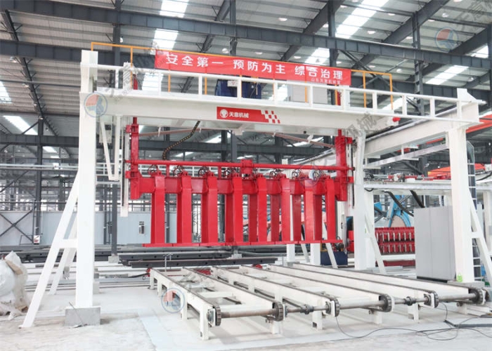 将板材吊运至板材输送机或者将砌块吊运至移动并坯机上;