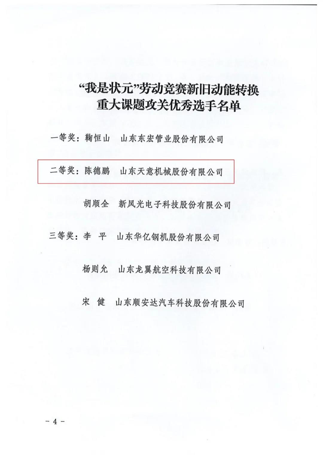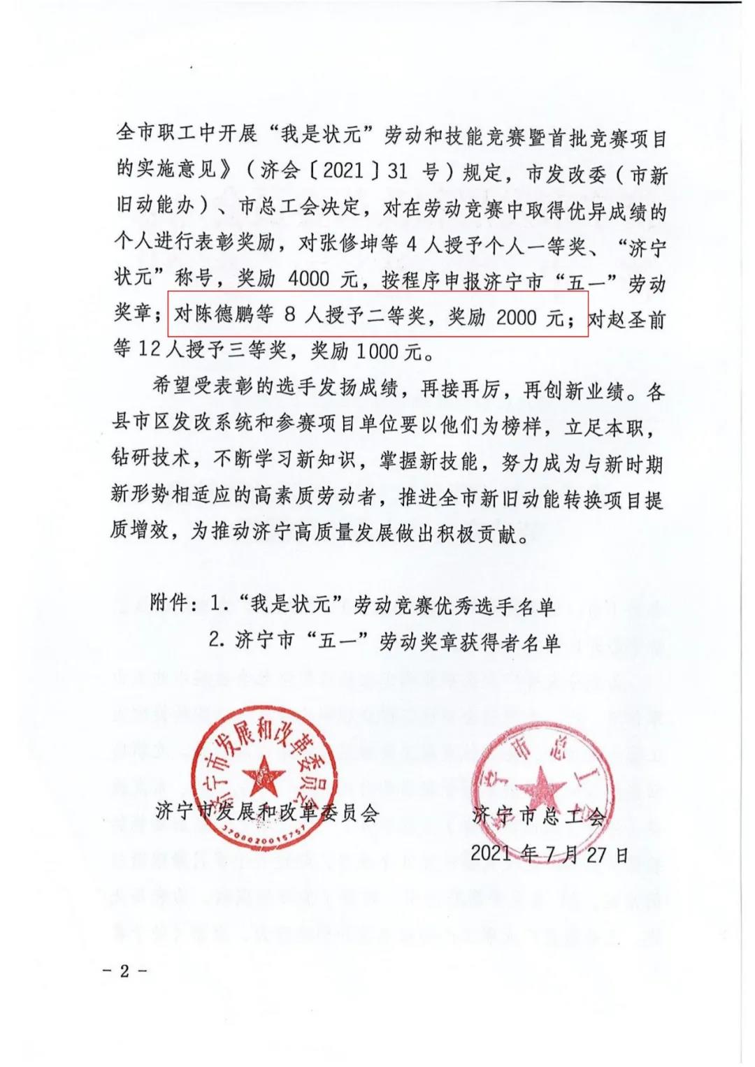 我司陈德鹏获得济宁市“我是状元”劳动竞赛新旧动能转换重大课题攻关竞赛单元二等奖