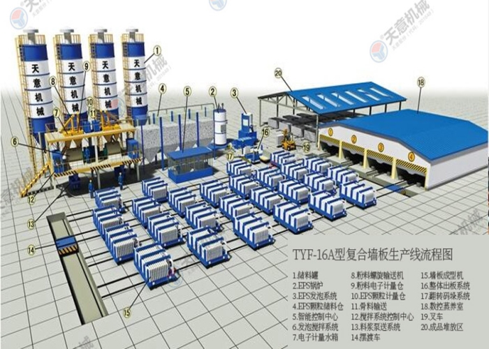 TYF-16A型复合墙板生产线是星空真人机械公司综合国内外技术经验,开发研制的新型墙体板材生产线。复合墙板生产线主要分为配料系统、搅拌系统、发泡系统、数控配电系统、墙板成型系统、料浆泵送系统、EPS预发系统、液压循环系统、整体出板系统。