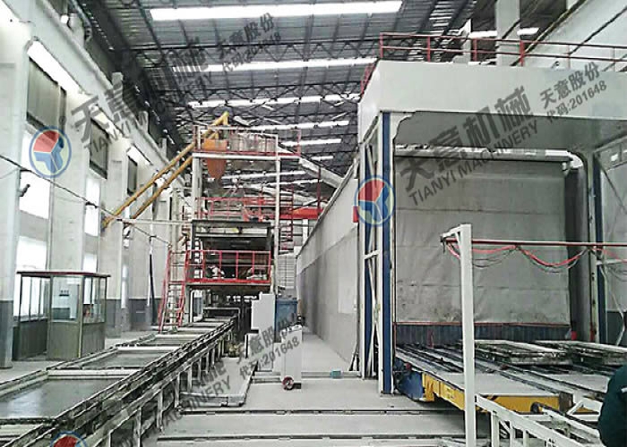 多功能墙板生产线,可生产“三明治”夹芯板,钢边框屋面板、楼面板,不带面板复合板。生产线主要分为自动配料系统、搅拌系统、发泡系统、中央控制配电系统、轻质混凝土布料系统、磨光系统、模具循环系统、养护系统、码垛系统等部分组成。
