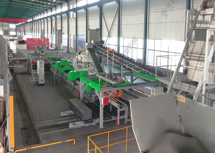 挤压墙板生产线结构紧凑,自动化程度高,设备主机固定,墙板成型时物料受挤压和振动同时作用,连续自动挤压振捣成型,保证墙板具有良好的密实性和外形尺寸,成型后进行初凝养护。板坯移动方便,场地使用灵活、利用效率高。成型工段推料挤压螺旋变频调速,由中央控制器调整控制灰渣板成型的密实程度,实现灰渣板的连续自动流水线生产。由于采用低水灰比的干硬性混合料挤压成型,可得到强度和密实度较高的空心墙板。自动化连续生产,效率高,质量一致性高,保障了墙板品质。广泛用于框架结构和钢结构建筑物。