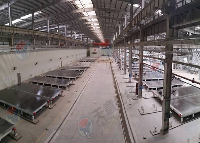 该生产线采用移动模台加中央摆渡车的形式来生产构件,比起固定模台来更加灵活,效率更高,浇筑振捣完的的构件由中央摆渡车将模台送入养护窑养护,布局合理,工艺先进,可同时生产多种混凝土预制构件。