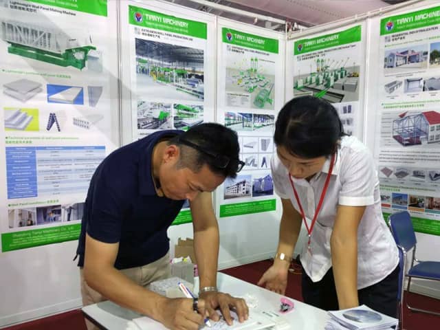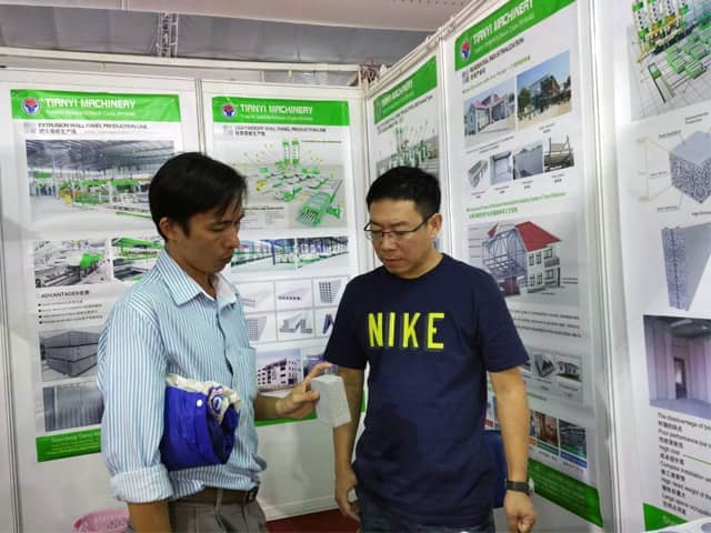 越南是亚洲经济发展速度的国家之一。近年来,越南正加大对基础设施建设和主要城市居民住宅的改造力度,绿色建筑建材装备缺口巨大,为适应市场需求,星空真人机械携绿色建材设备参展了此次展会。展会期间,外贸销售部李经理,认真对待每位来访的客户,详细向其介绍星空真人机械专利产品轻质墙板生产线,复合墙板生产线,保温装饰一体化板生产线等产品的优势,以及设备在东南亚地区建筑建材市场的影响,展会现场就有多数客户,初步签订了轻质墙板生产线、复合墙板生产线加工生产订单。